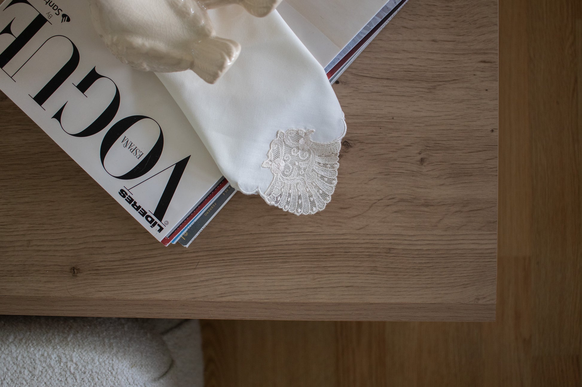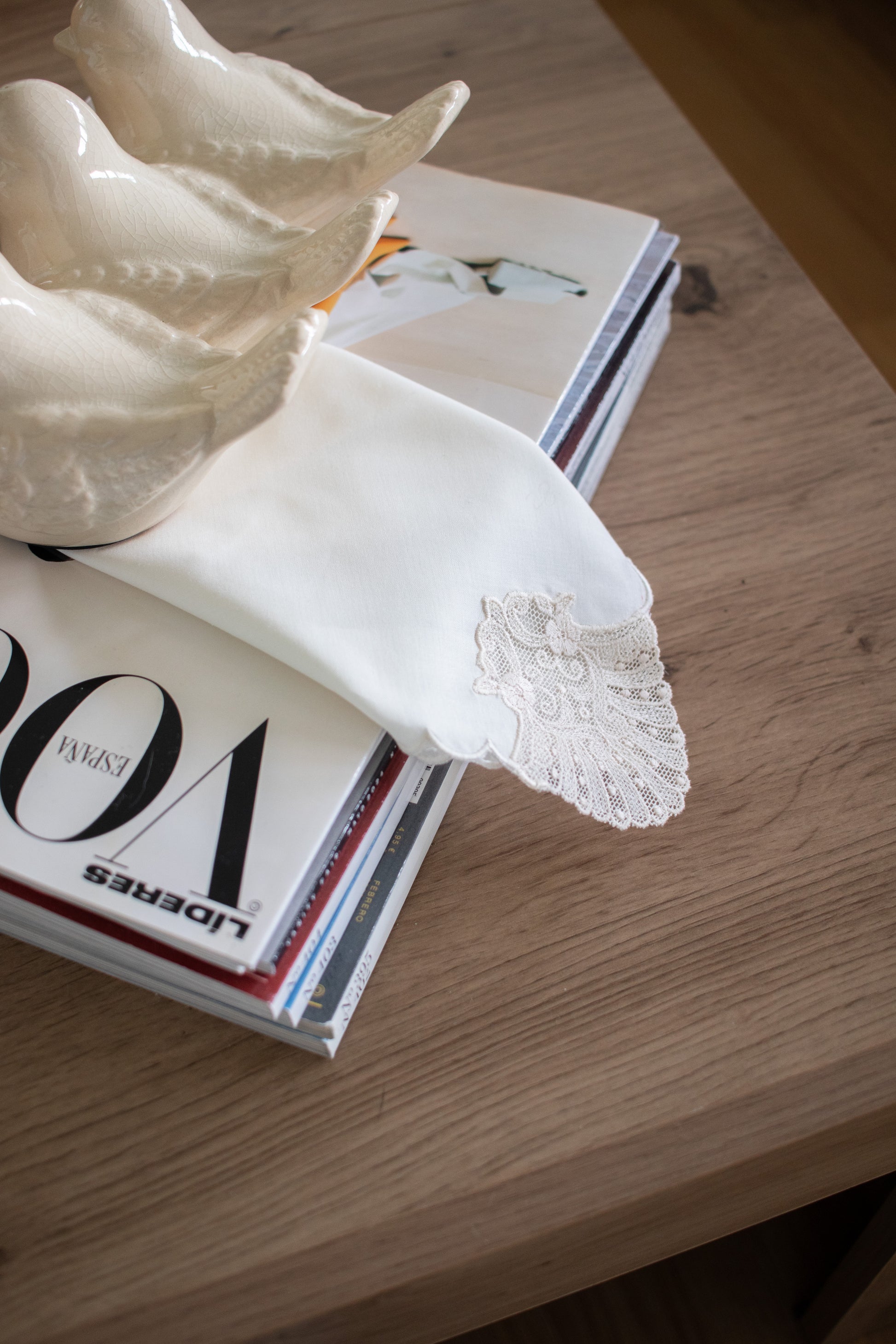 Un pañuelo delicado y ligero, con encaje ornamental que remite a otra época. Ideal como detalle especial para regalar, como complemento en días señalados o incluso como pañuelo de novia. Un pequeño gesto que guarda belleza, memoria y tradición.